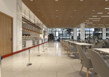 餐廳以樸素無華的原木材料裝飾墻面,時尚大方,搭配暖黃燈光、原木色和淺灰色的皮座椅,營造溫暖干凈、自然質樸的就餐環境,能夠同時滿足度假與商務需求。空間布局則以自助餐臺裝飾、用餐區陳設的食盒、食材、器物等再現古臨安集市繁華的市井氣息。